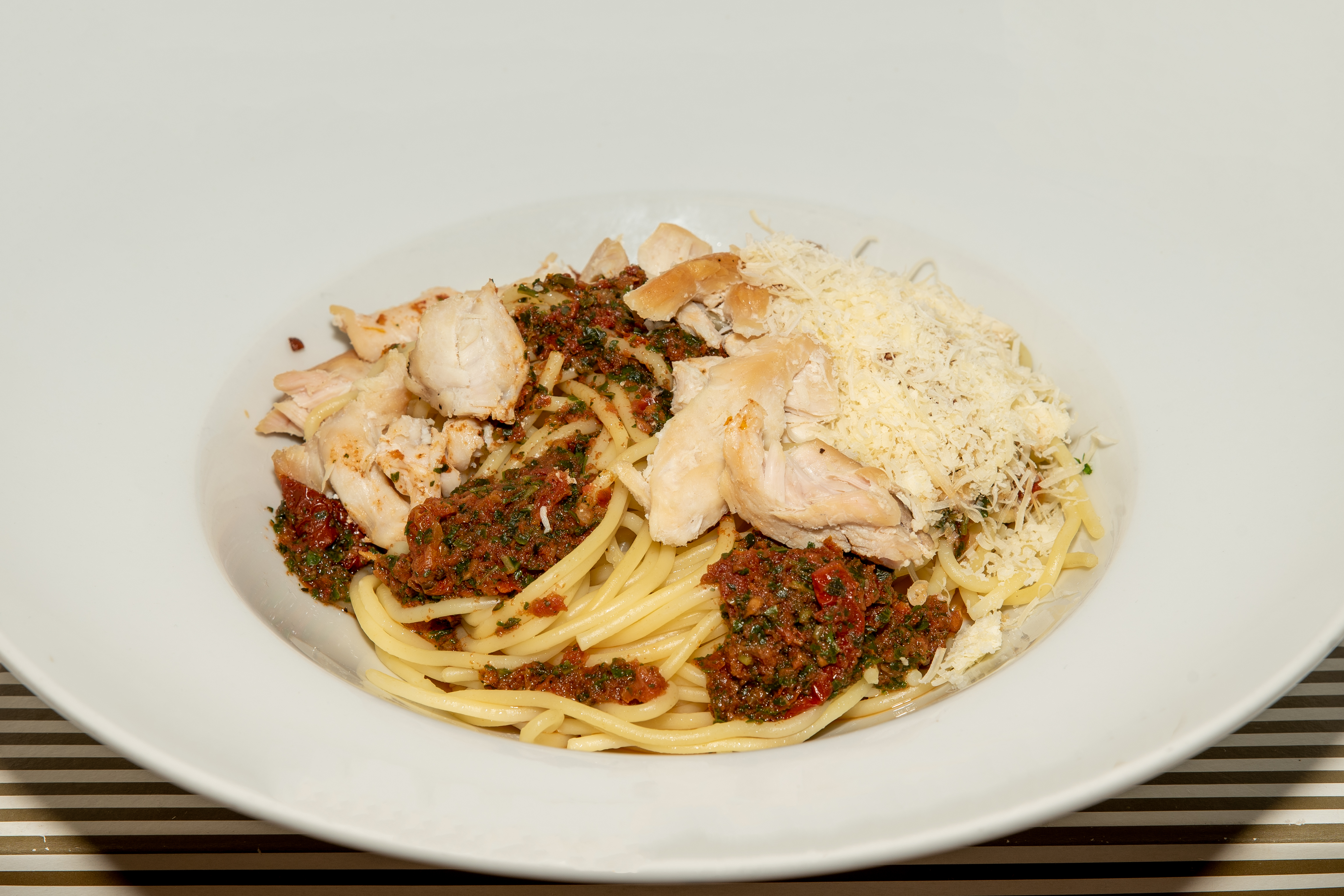 Špagety s kuřecím masem a pestem z bazalky a sušených rajčat.