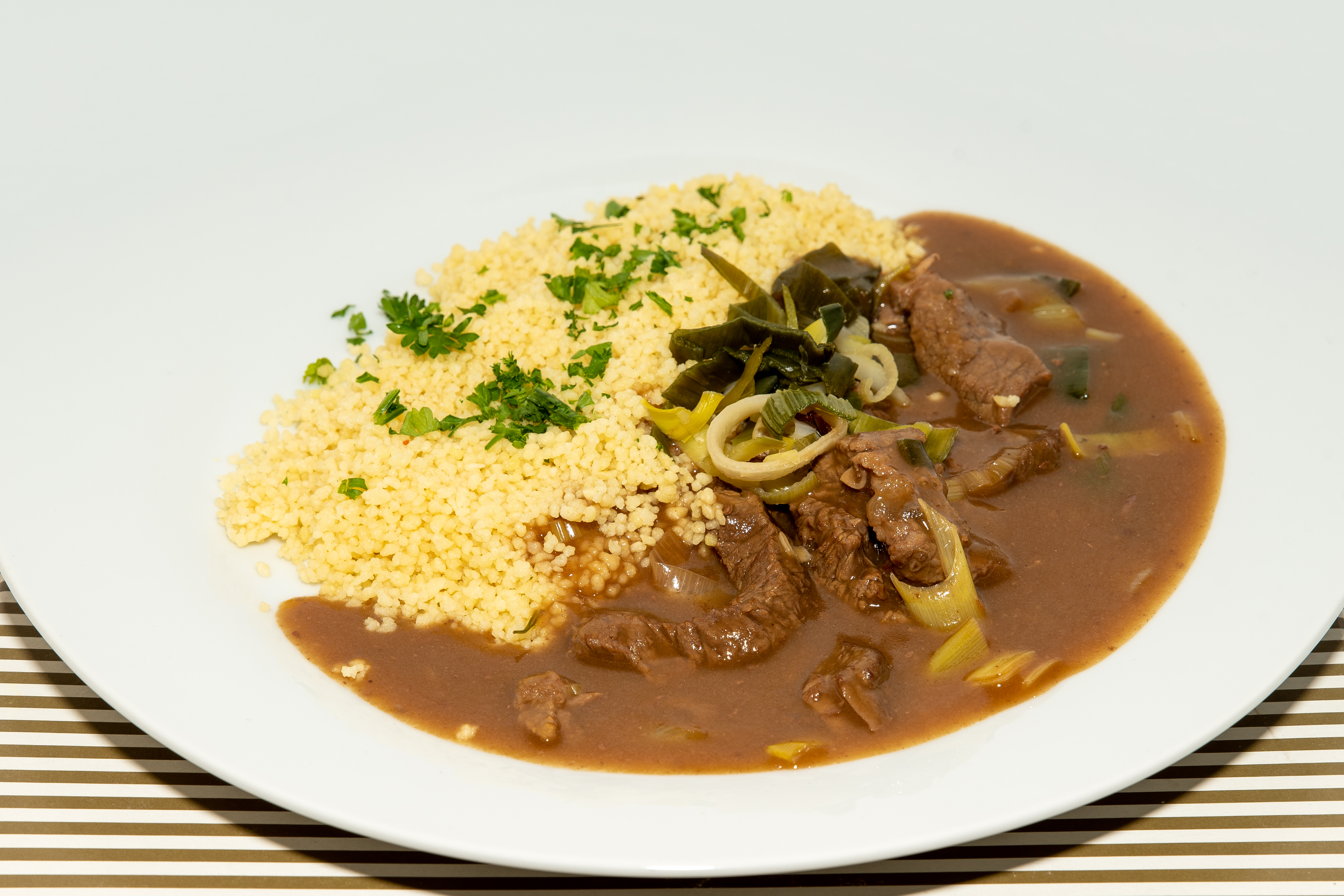 Hovězí nudličky s pórkem, podávané s kuskusem.