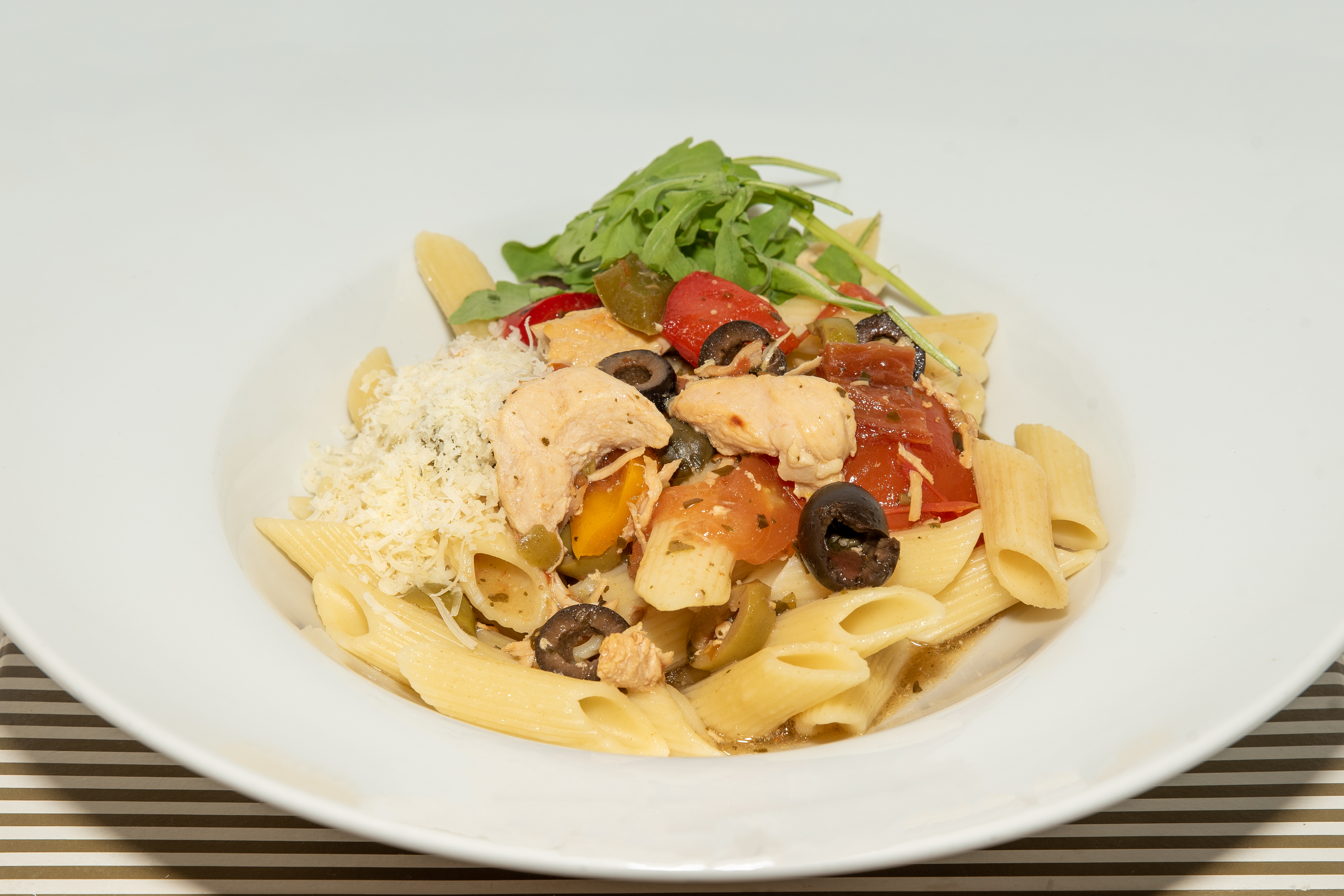 Penne s krůtím masem, sušenými rajčaty, kapary, rukolou a parmezánem.