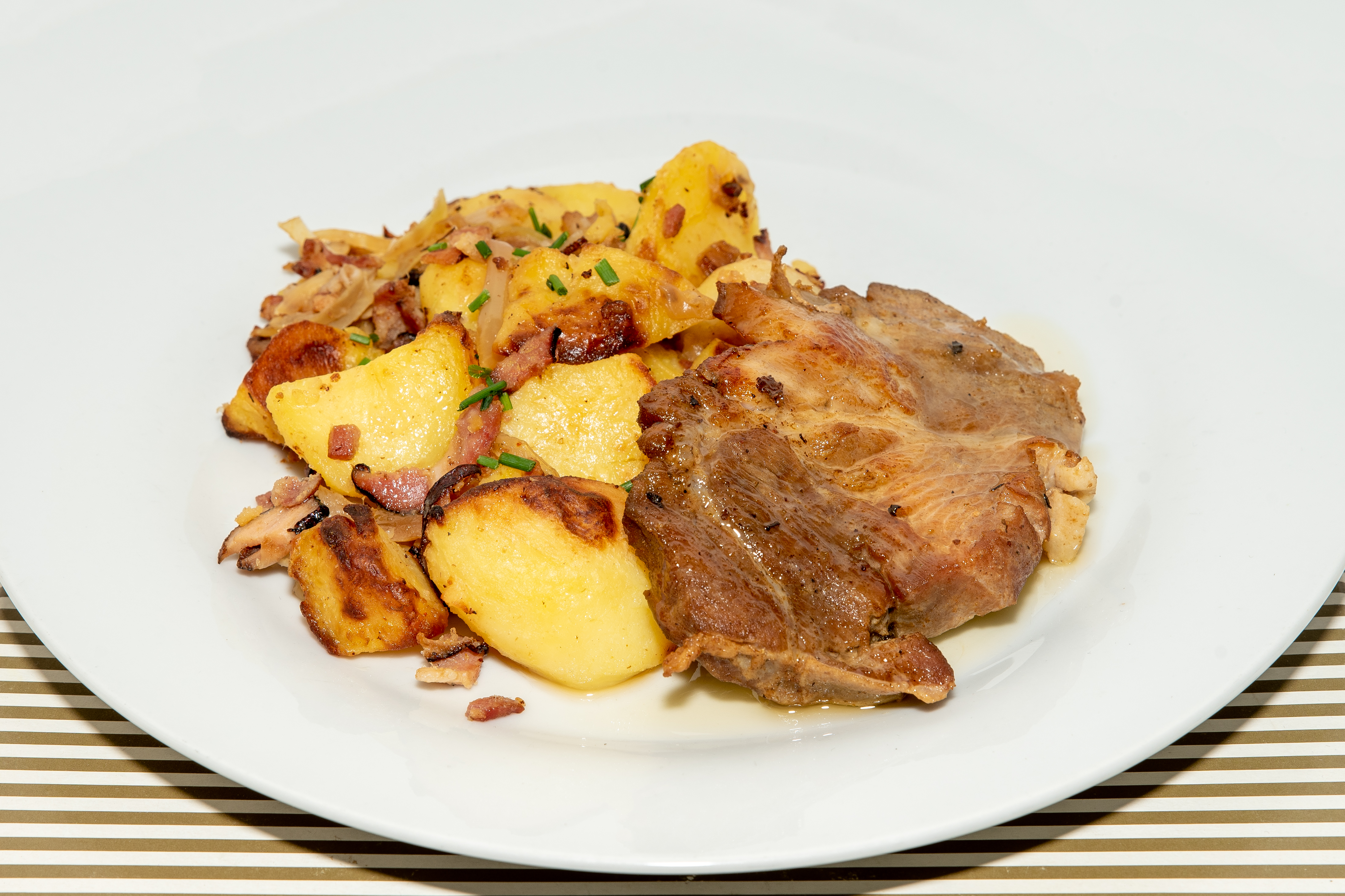 Grilovaná krkovice na rozmarýnu s lyonskými bramborami (cibule, slanina).