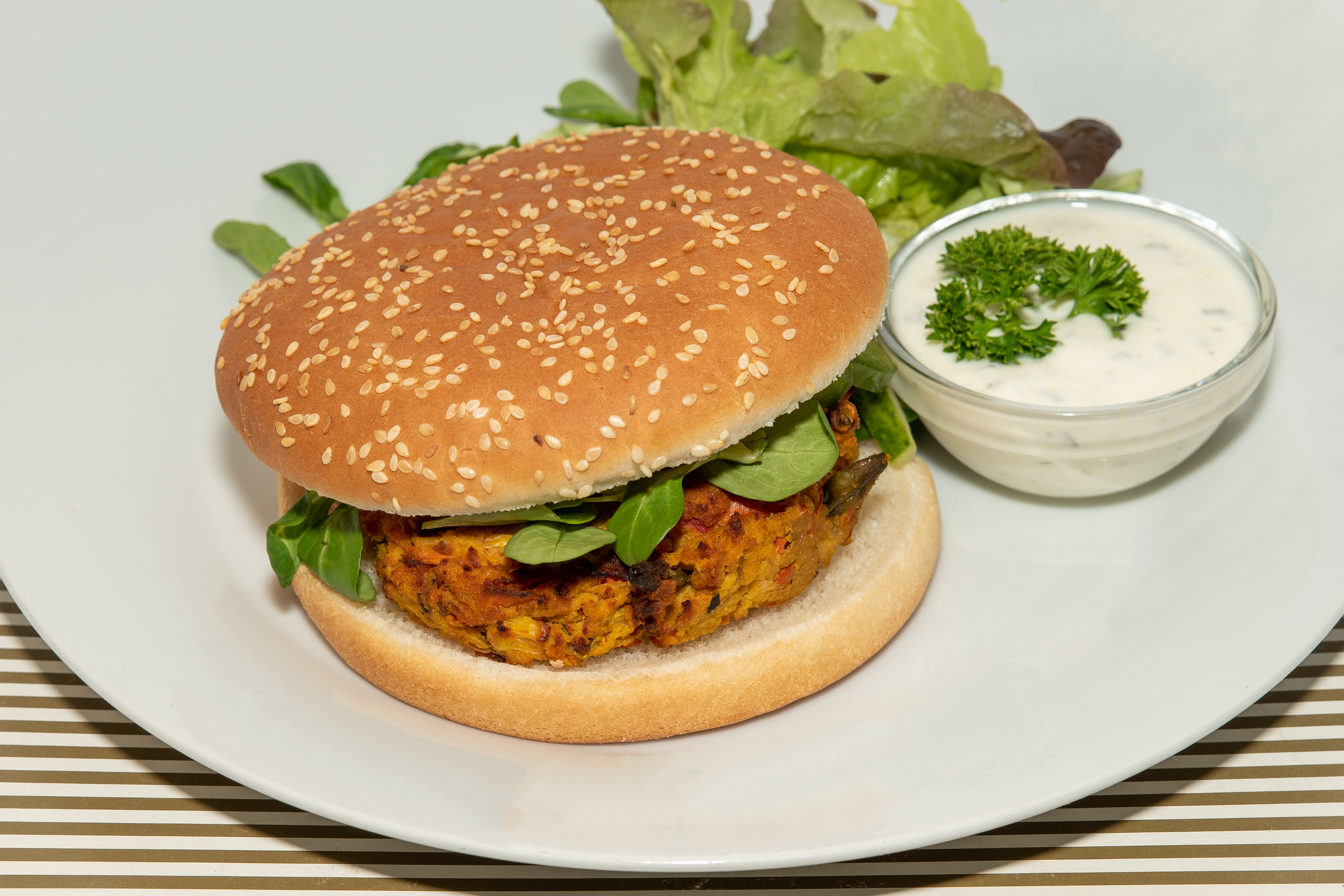 Zeleninový burger v housce, bylinkový dip, mix salátů.