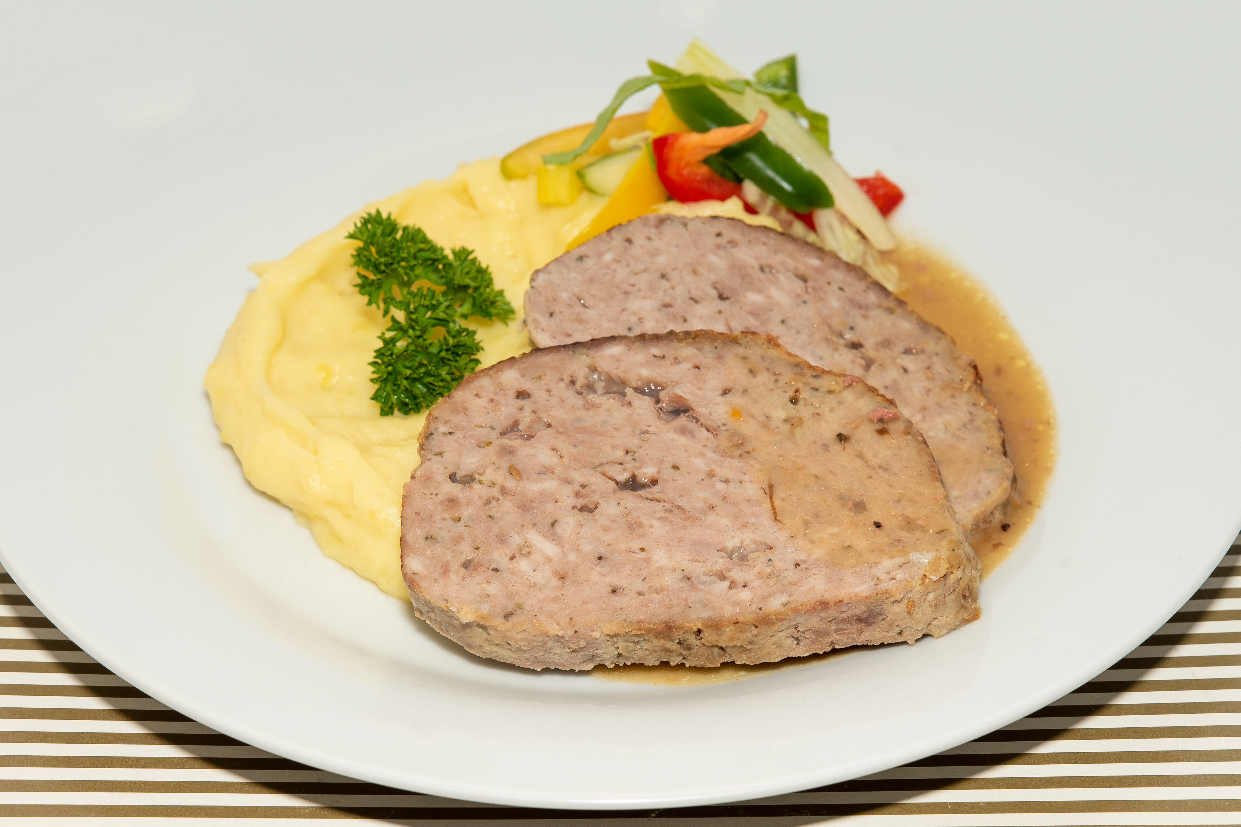 Domácí sekaná pečeně s bramborovou kaší a okurkou.