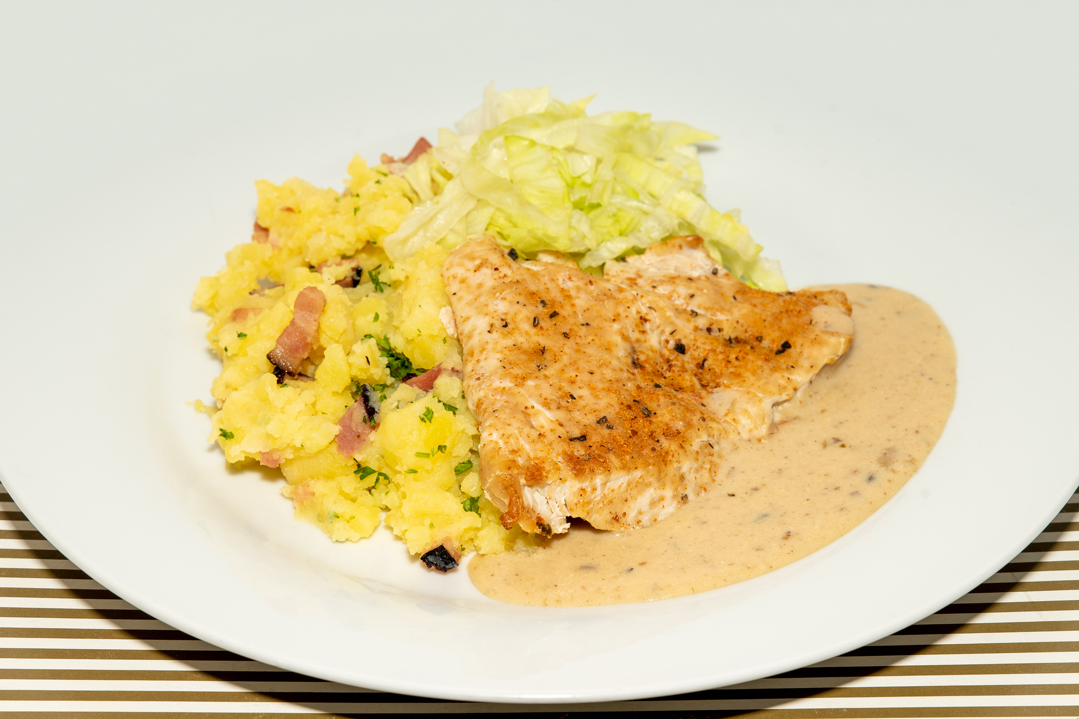 Krůtí steak s pepřovou omáčkou, šťouchané brambory se slaninou.