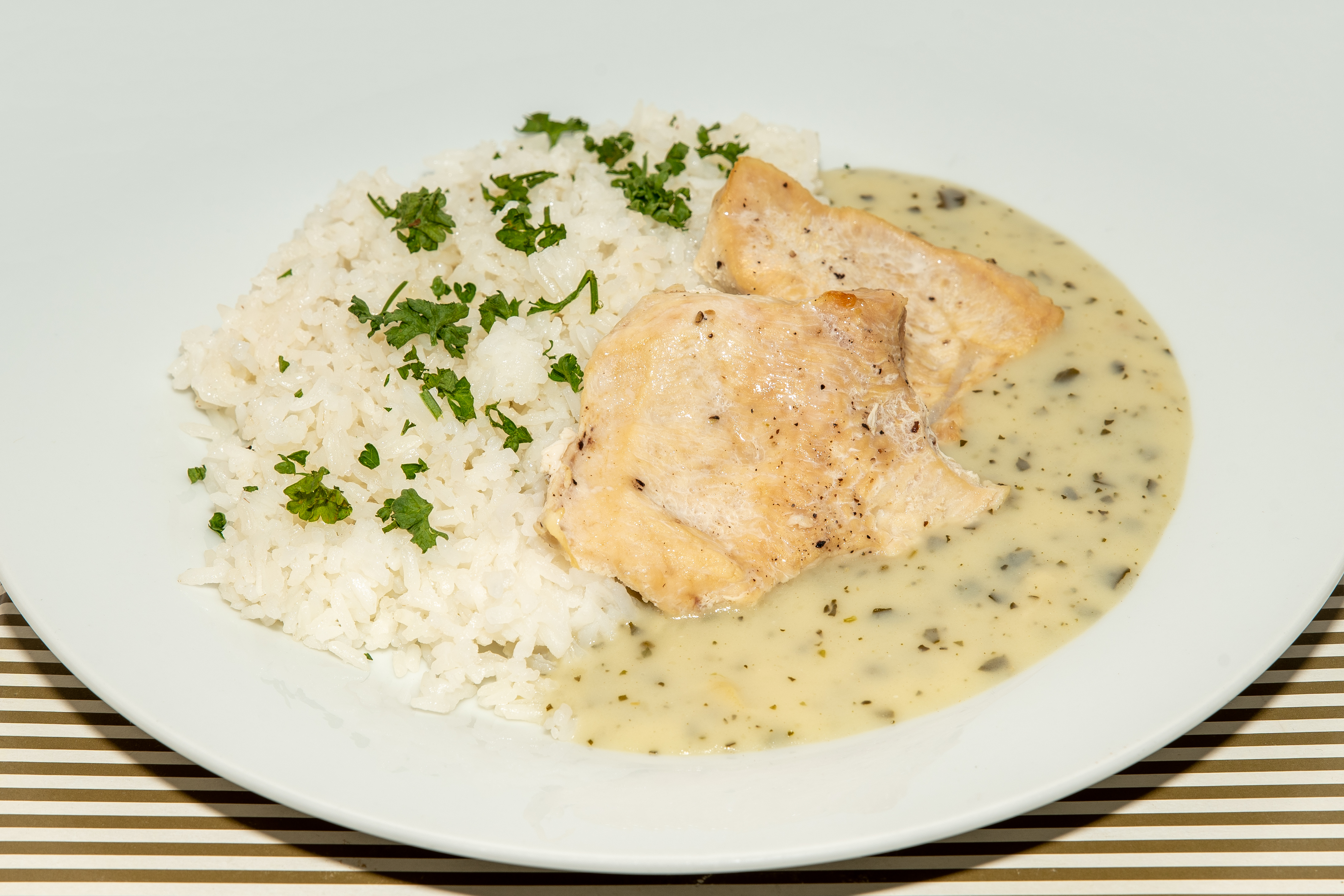 Krůtí medailonky s bazalkovou omáčkou a rýží.
