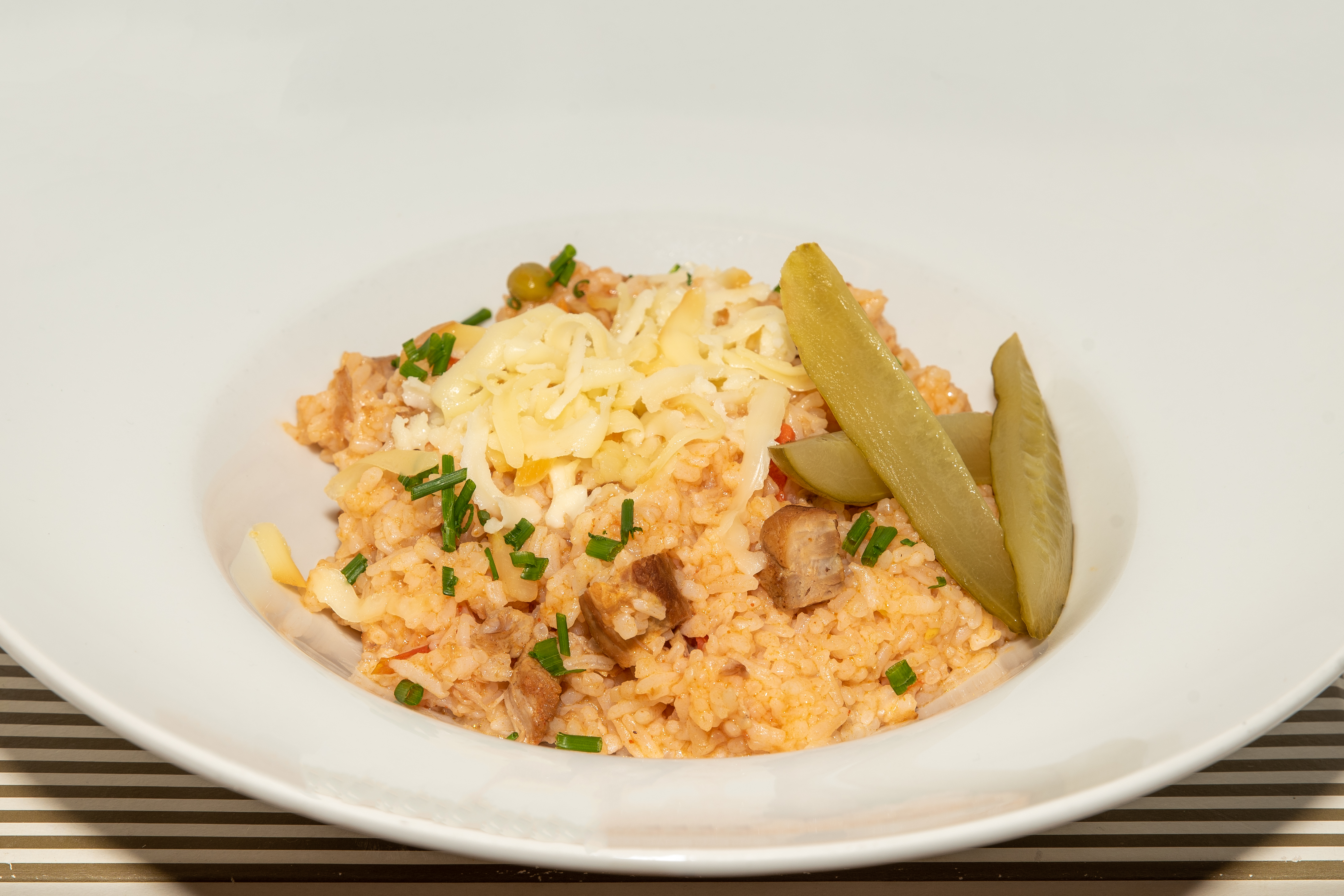 Srbské vepřové rizoto sypané sýrem, nakládaná okurka.