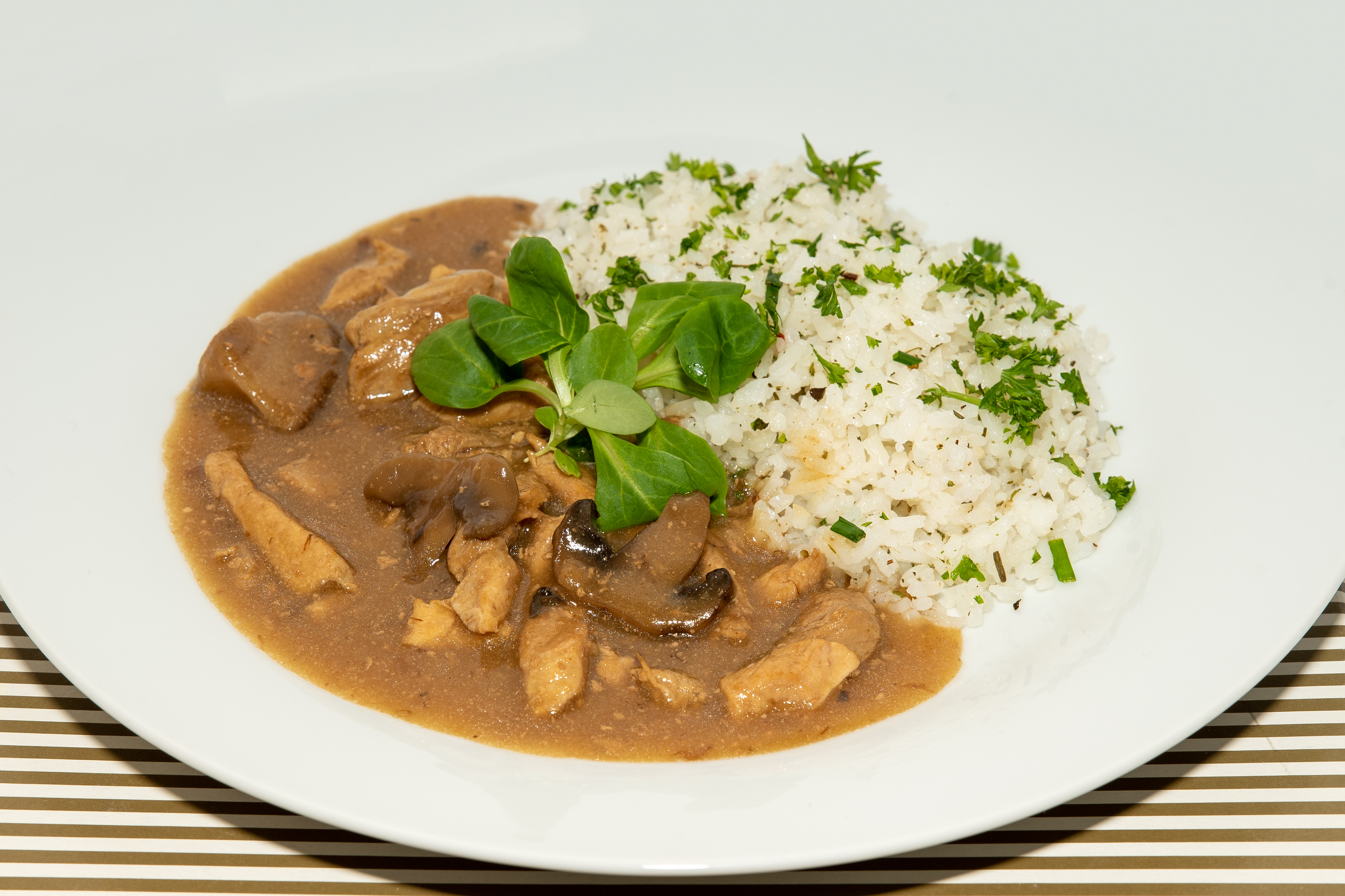 Vepřové nudličky na houbách s rýží.