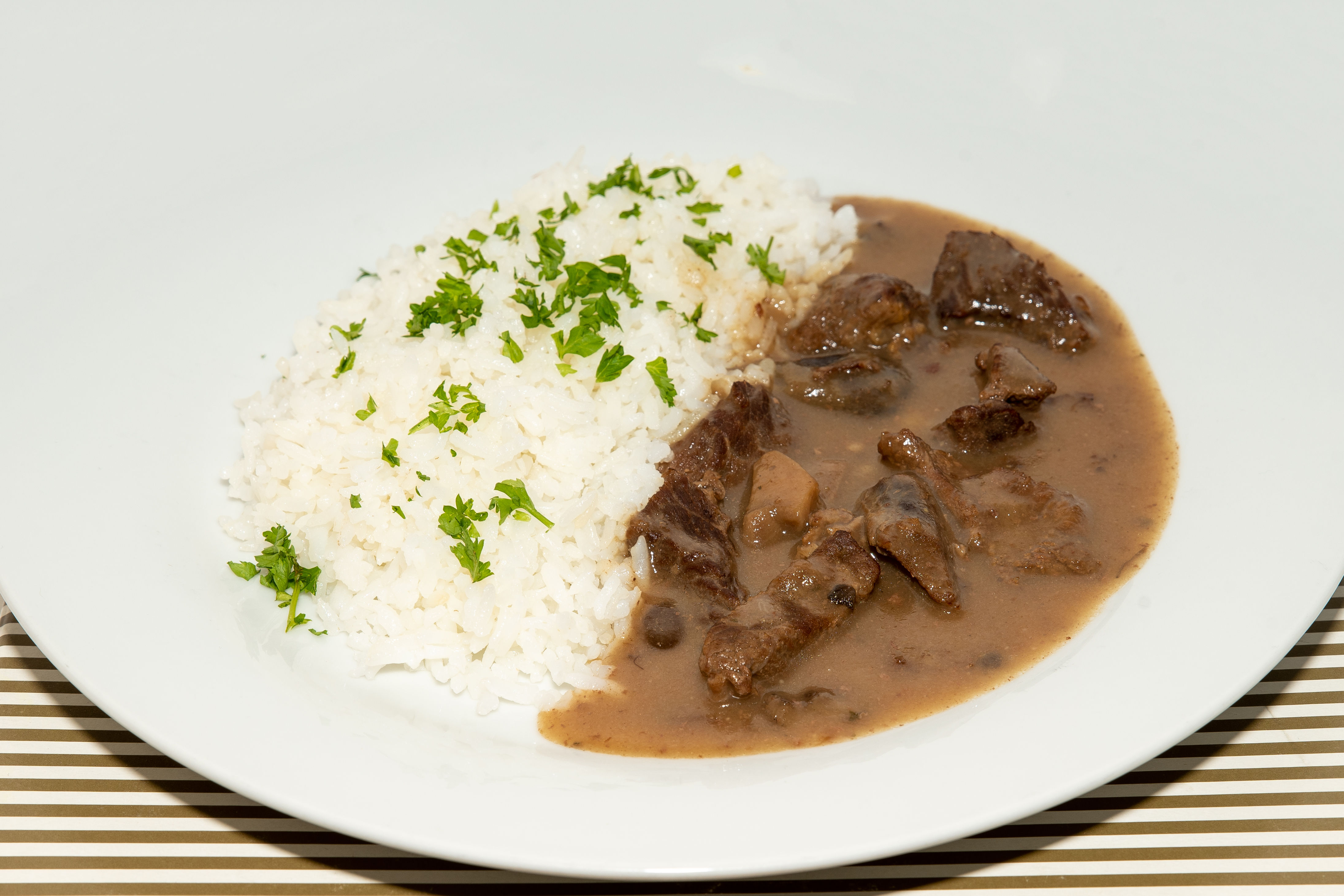 Hovězí nudličky na hříbkách s dušenou rýží.