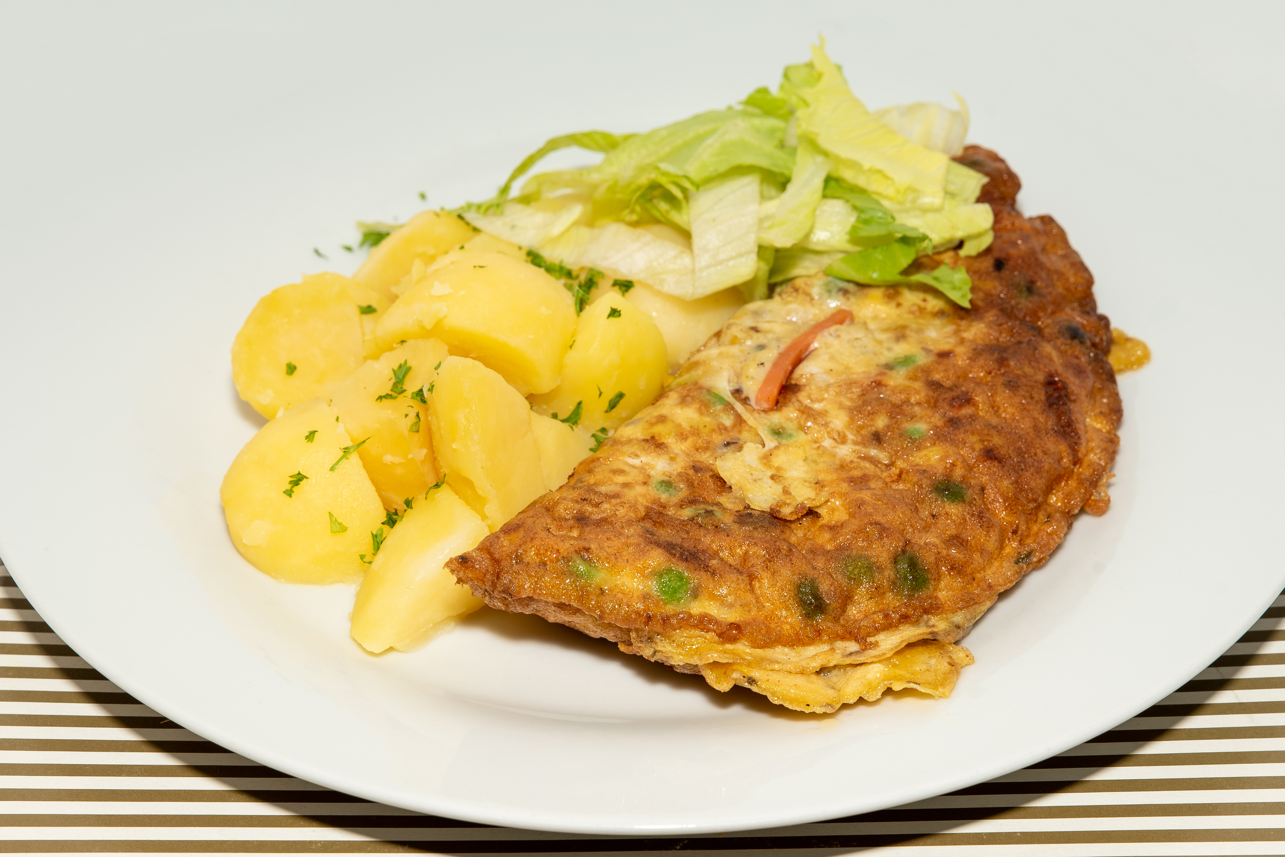 Vaječná omeleta se zeleninou, vařené brambory a ledový salát.