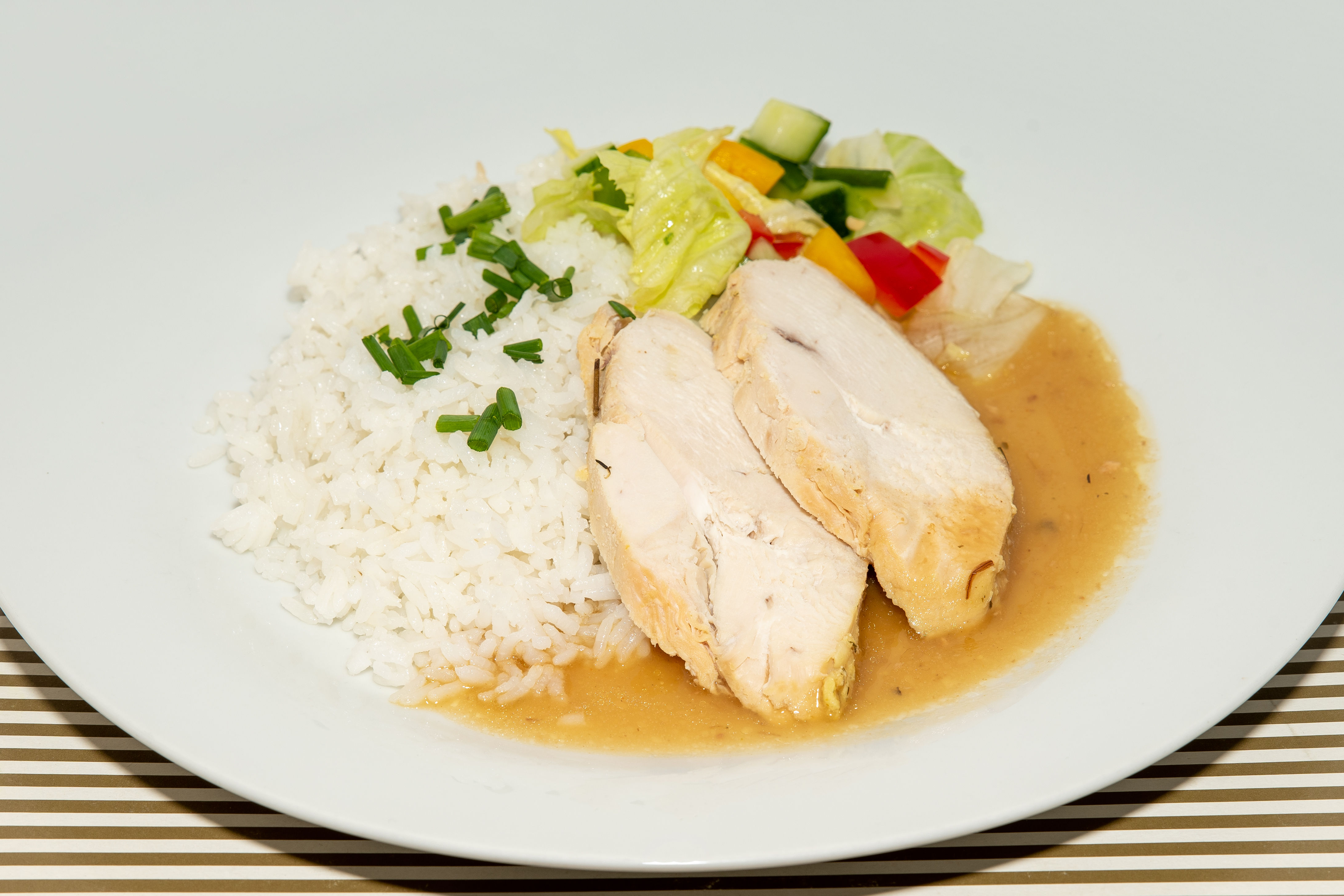 Citrónové kuře s bylinkami, rýže a zeleninový salát.