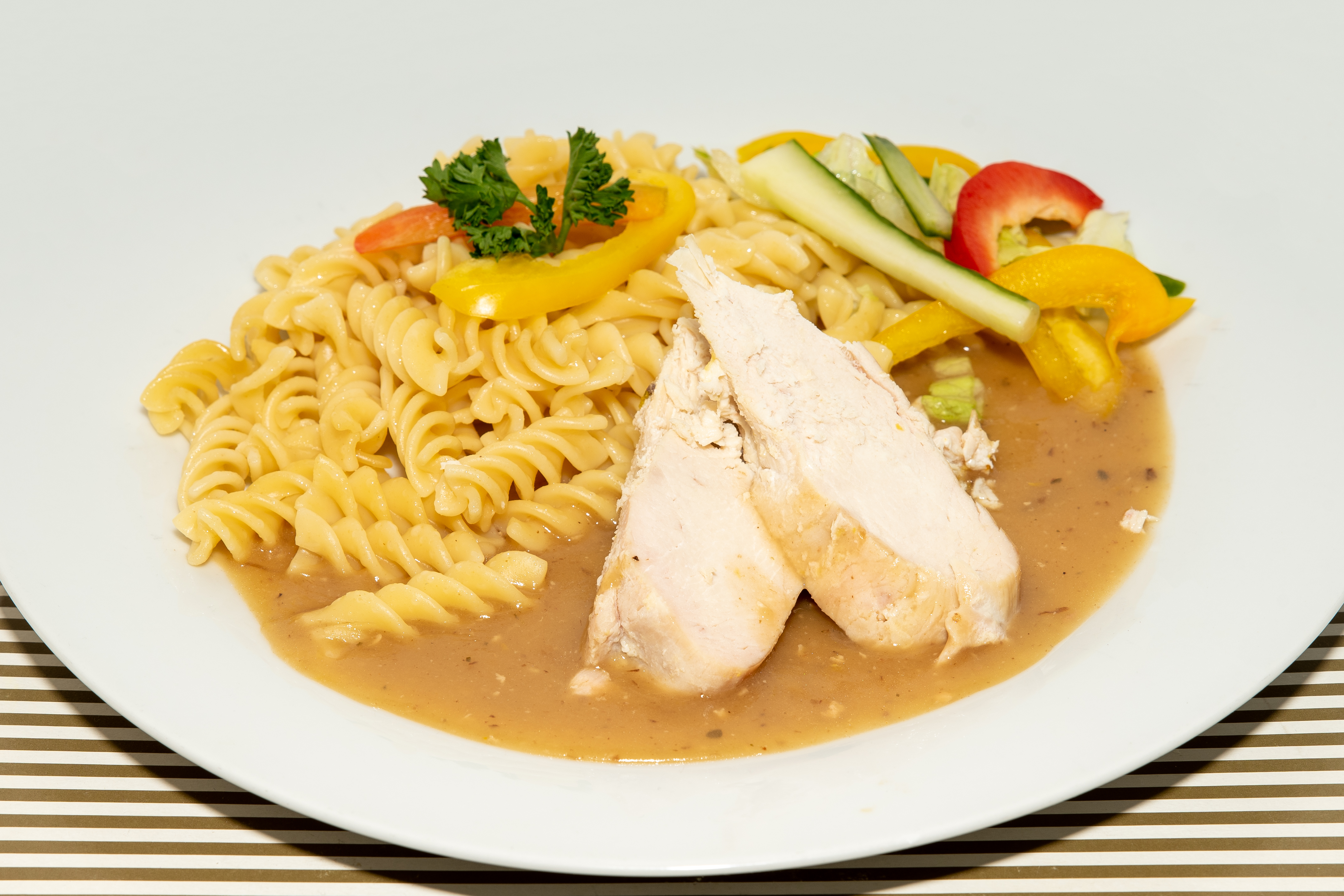 Citrónové kuře s bylinkami, těstoviny a zeleninový salát.