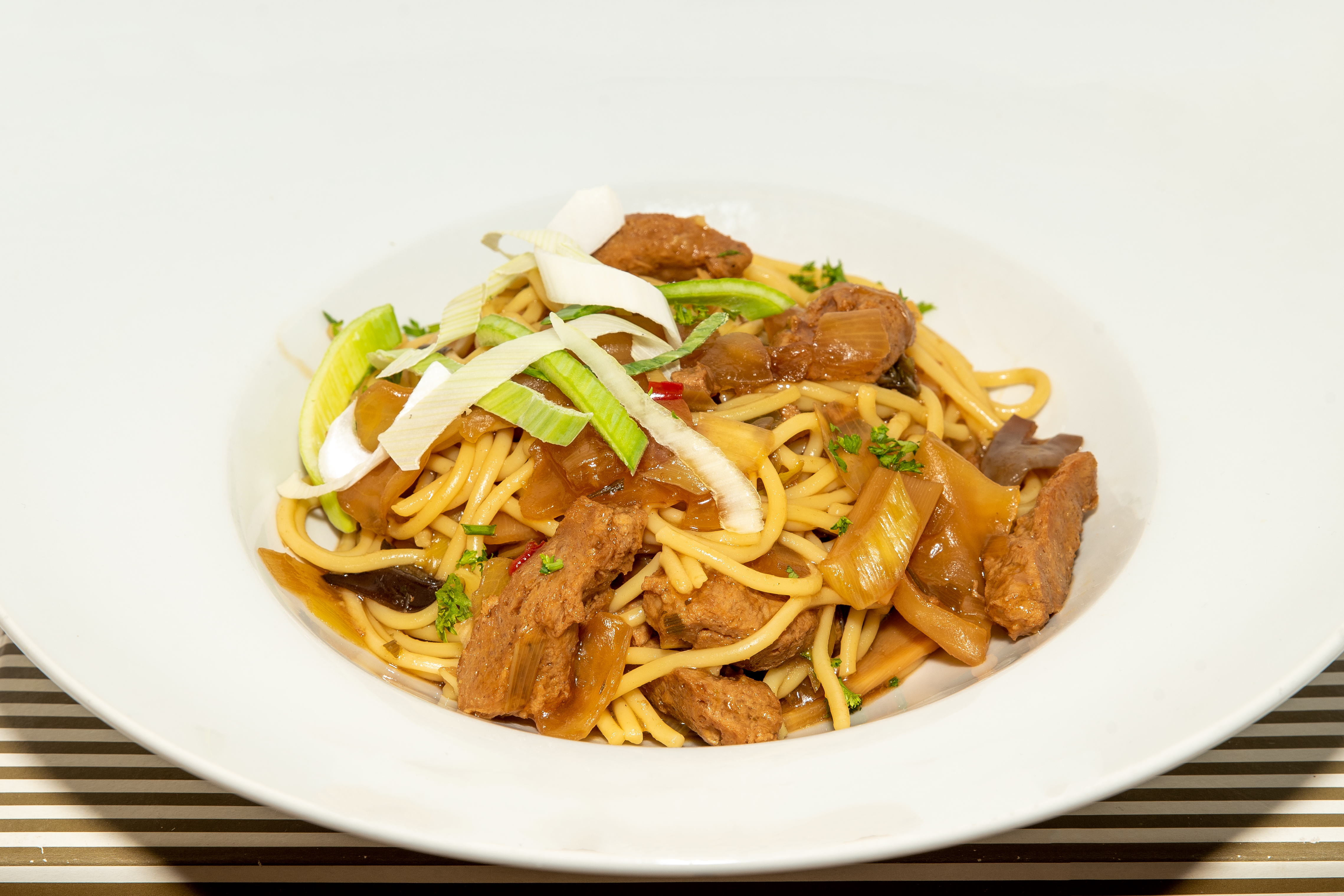 Vegetariánské čínské nudle se zeleninou a sójovým masem.