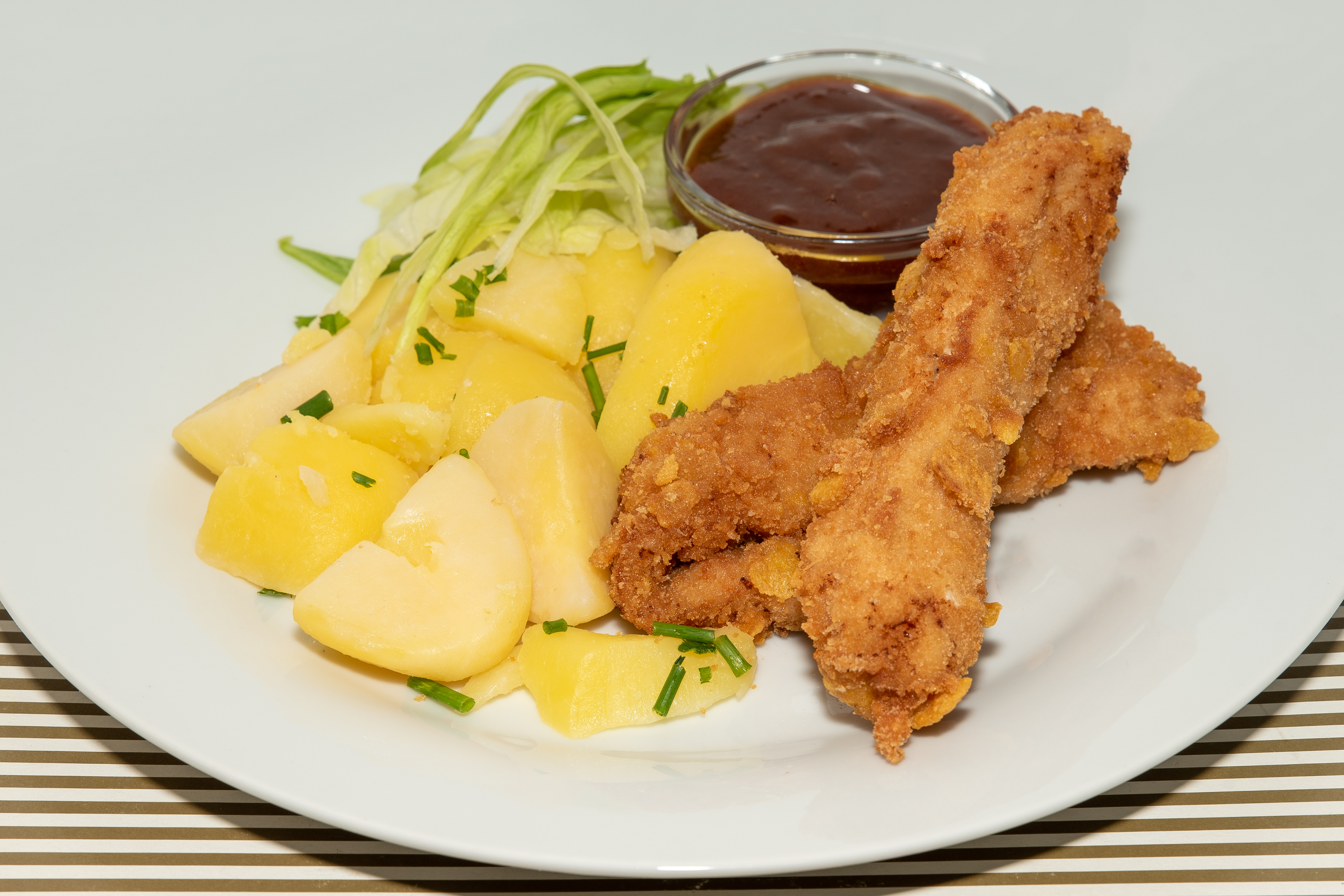 Krůtí stripsy s BBQ omáčkou a vařenými bramborami, salát.