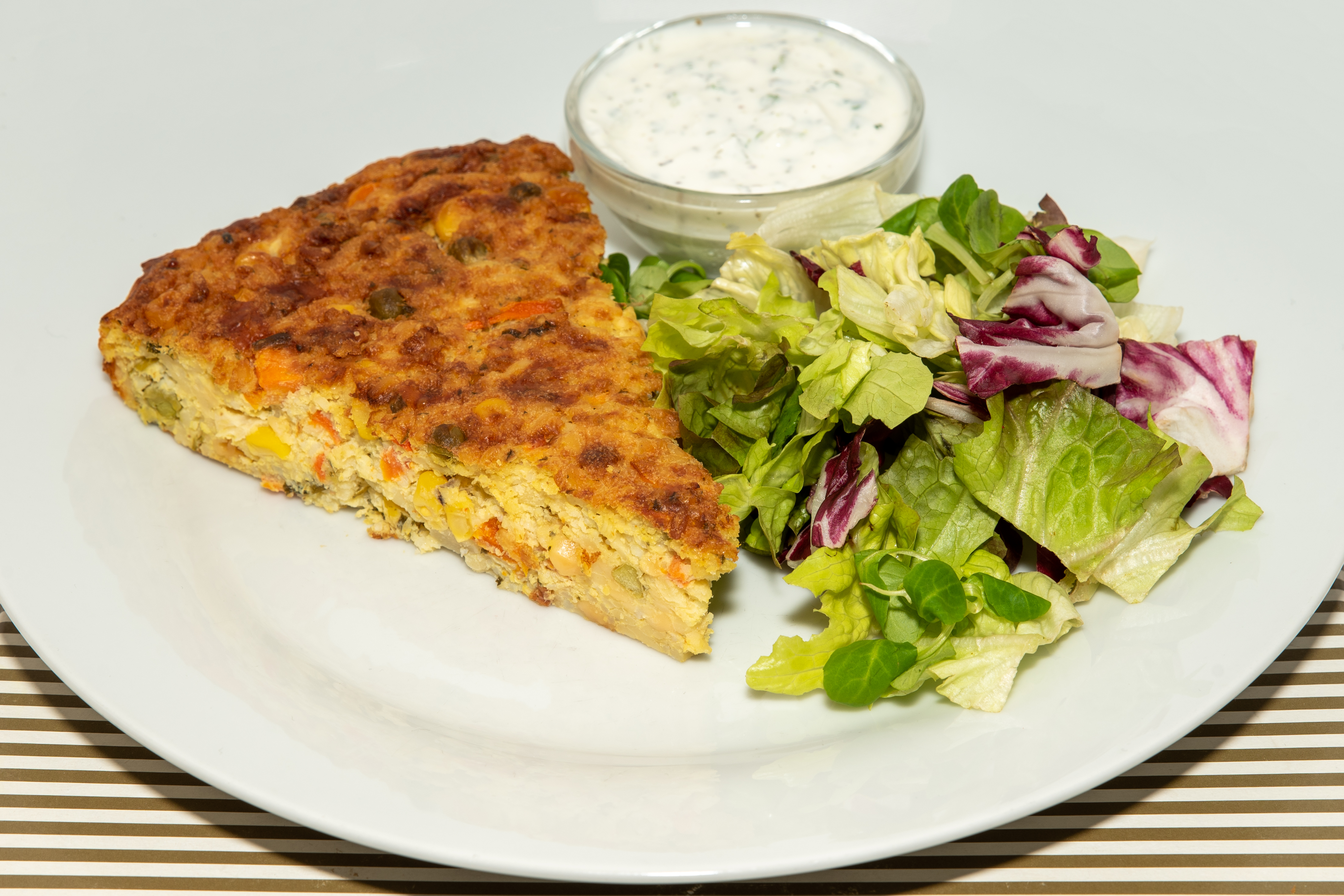 Jáhlovo-zeleninový koláč se sýrem, listový salát, dip.