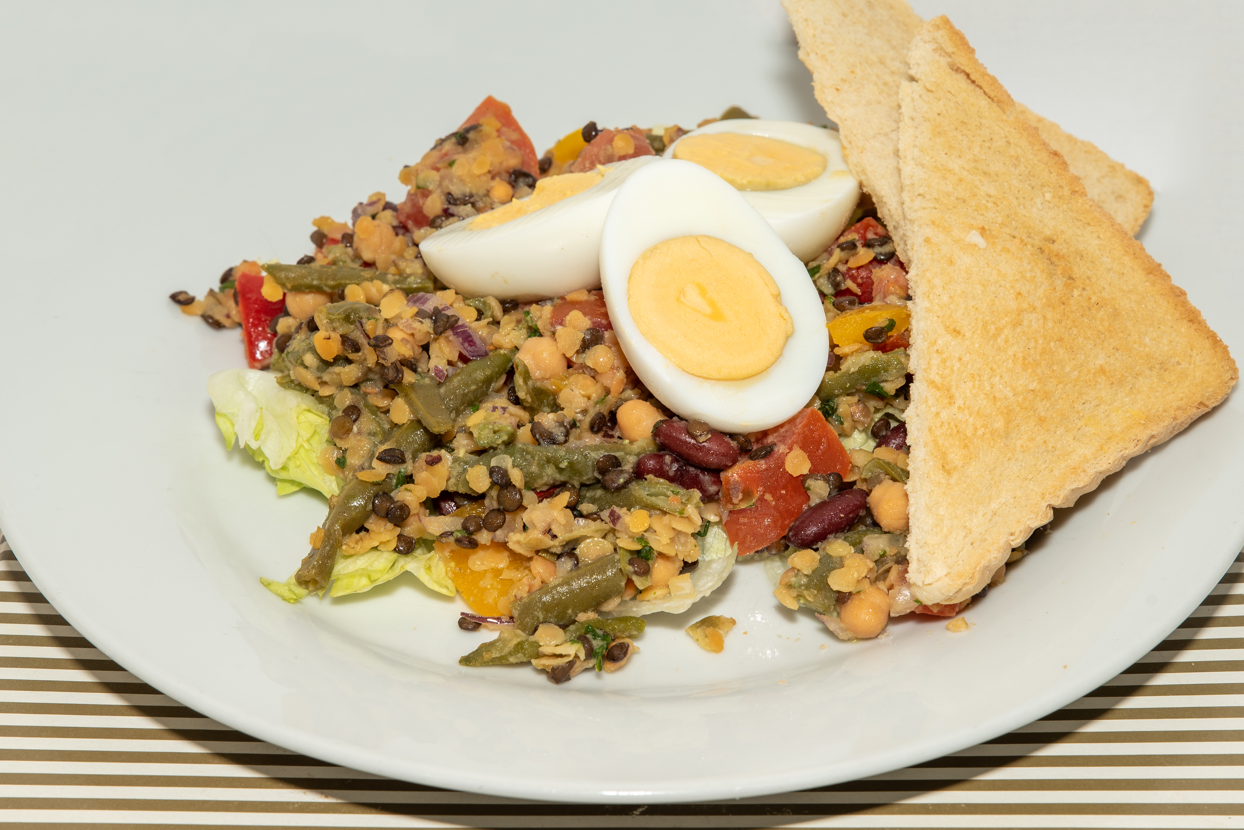 Luštěninový salát s vejci a opečeným toastem.
