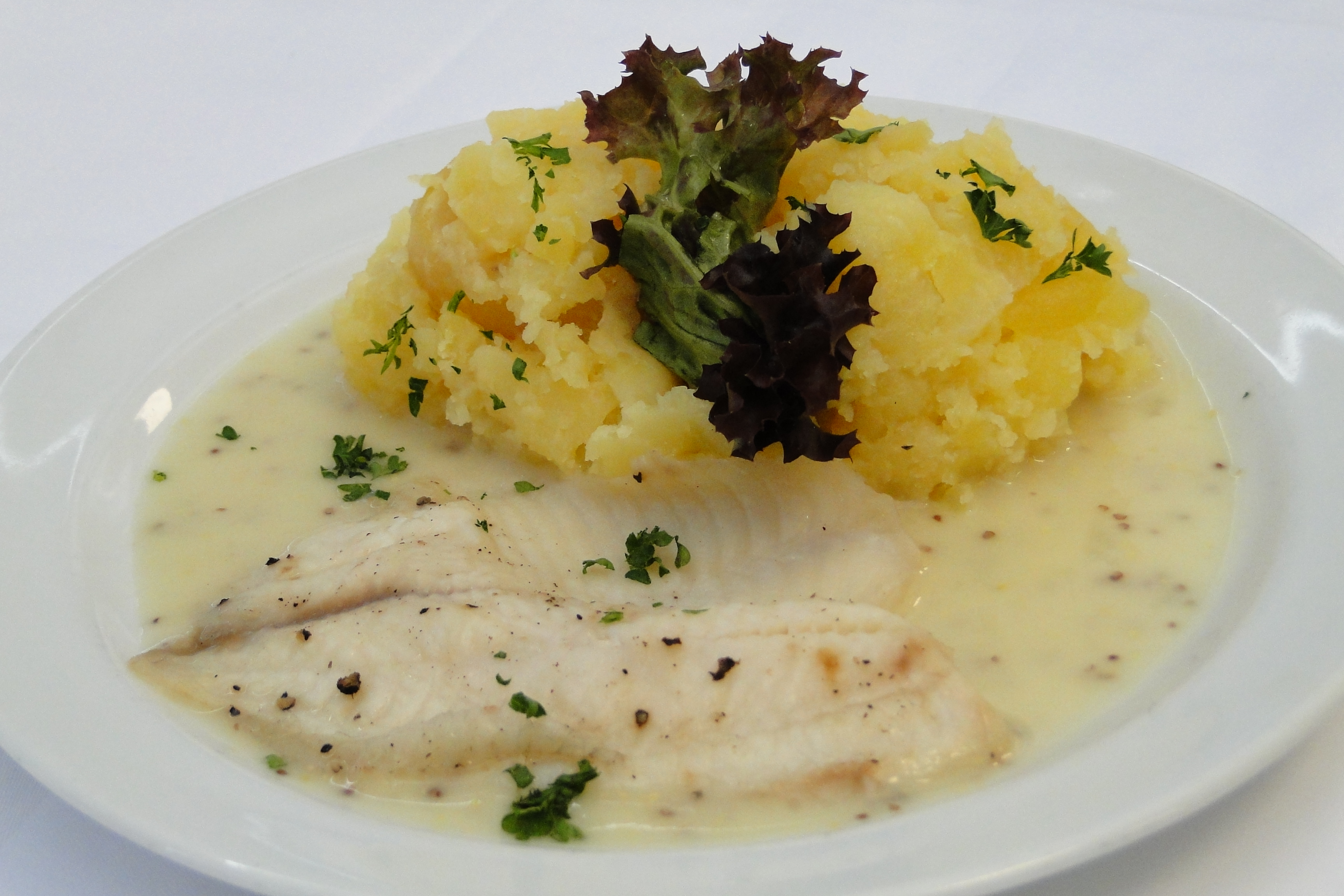 Pečená treska s hořčičnou omáčkou a šťouchanými bramborami.